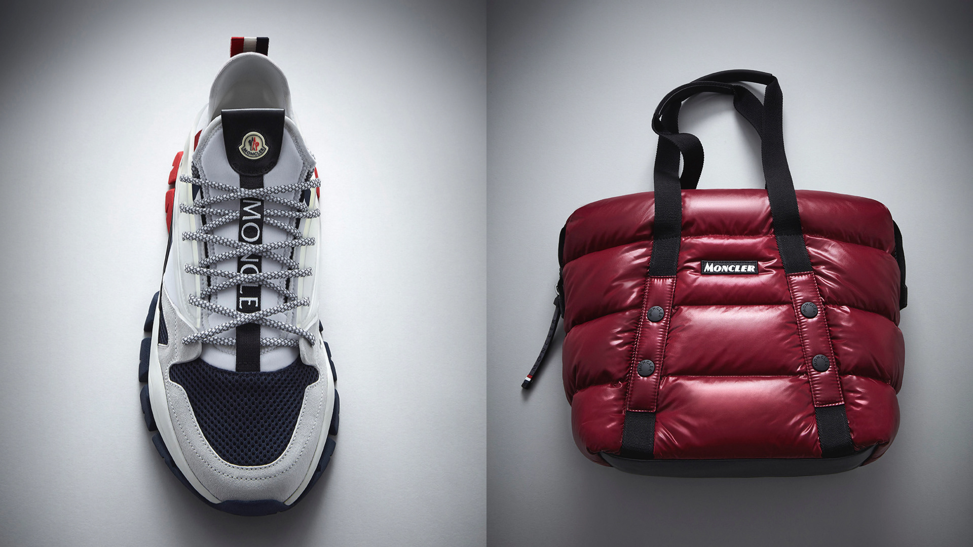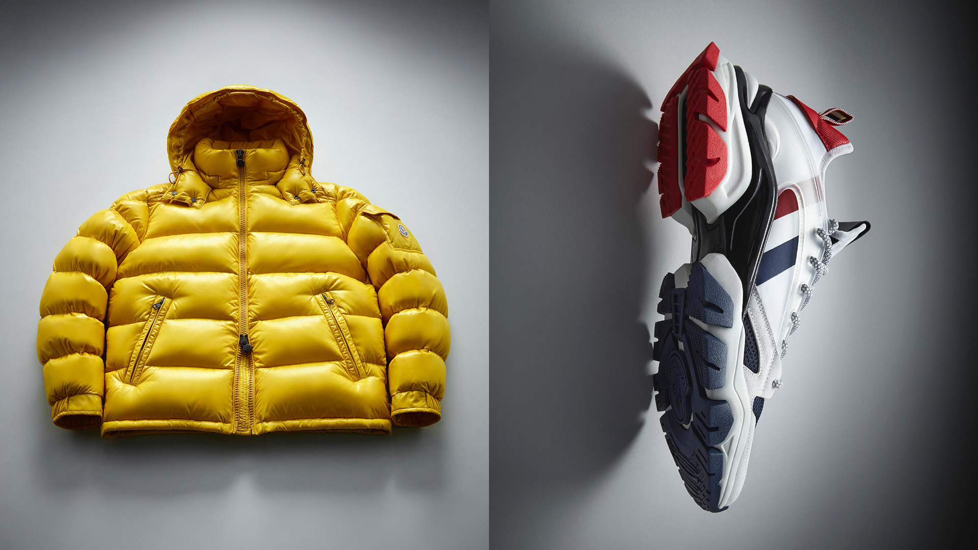 A still life photoshoot that highlights Moncler jackets and accessories, emphasising the iconic doudoune motif and french flag. (Ph. Marco Gazza)