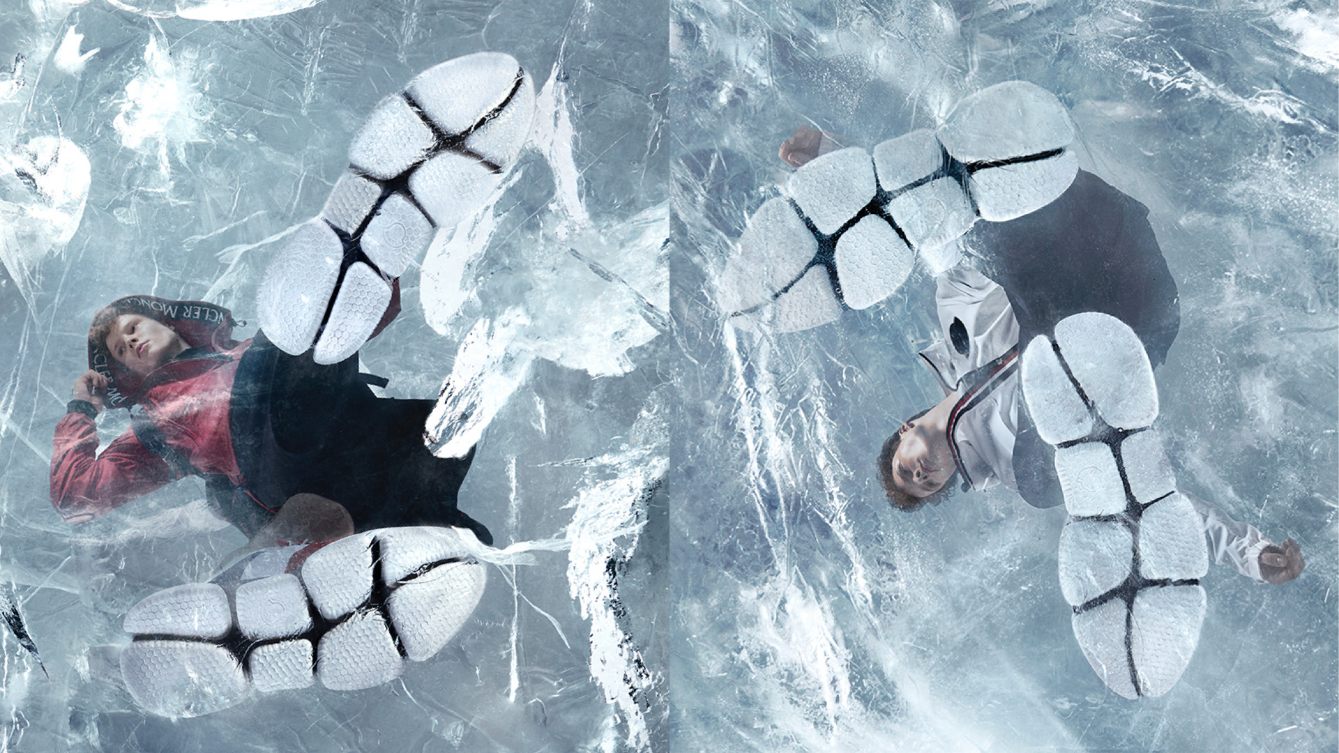 This campaign showcases the unique design of the sole of the Moncler Bubble Sneaker, featuring an invisible man walking in the video and a shoe encased on an ice block to emphasise its innovative design. (Still Life Ph. Marco Gazza / Model Ph. Tassili Calatroni)